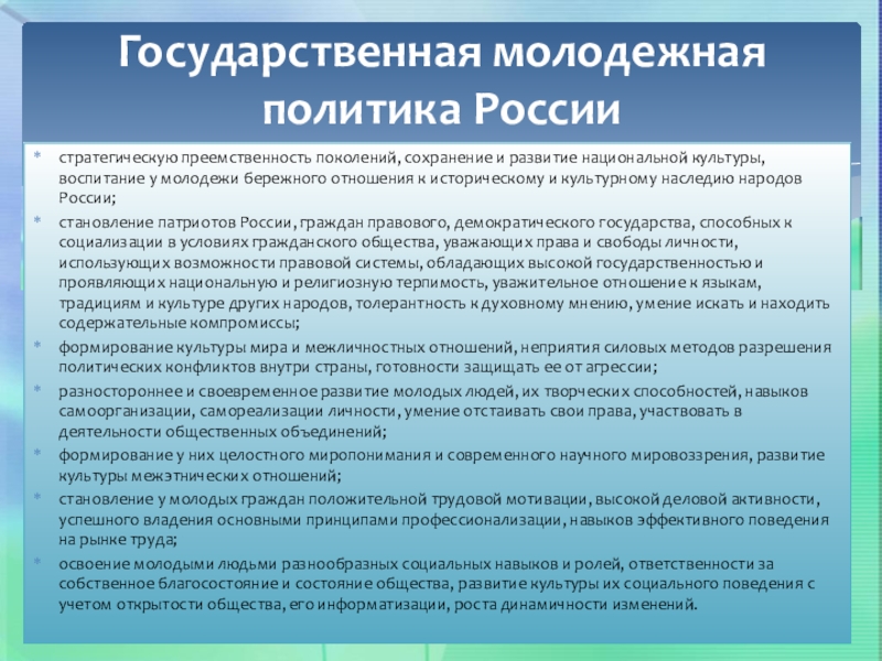 стратегическую преемственность поколений, сохранение и развитие национальной культуры,