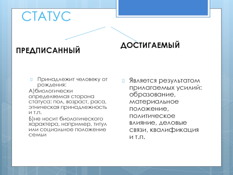 Является результатом прилагаемых усилий: образование, материальное положение, политическое влияние, деловые связи, квалификация и т.п.