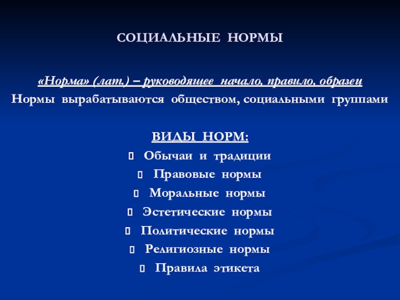 СОЦИАЛЬНЫЕ НОРМЫ«Норма» (лат.) – руководящее начало, правило, образецНормы вырабатываются обществом, социальными группамиВИДЫ НОРМ:Обычаи и традицииПравовые нормыМоральные нормыЭстетические нормыПолитические нормыРелигиозные нормыПравила этикетаРОЛЬ НОРМ: упорядочение жизни общества