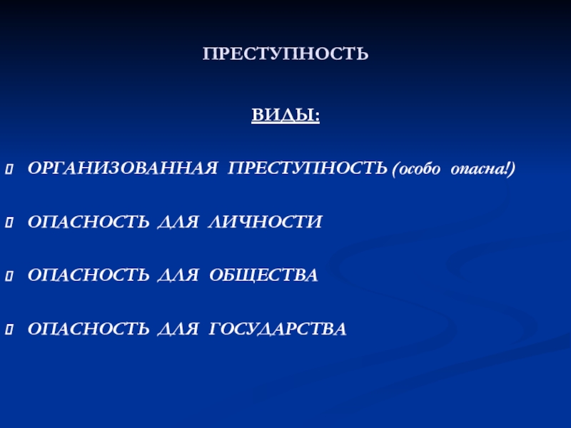 ПРЕСТУПНОСТЬВИДЫ:ОРГАНИЗОВАННАЯ ПРЕСТУПНОСТЬ (особо опасна!)ОПАСНОСТЬ ДЛЯ ЛИЧНОСТИОПАСНОСТЬ ДЛЯ ОБЩЕСТВАОПАСНОСТЬ ДЛЯ ГОСУДАРСТВА