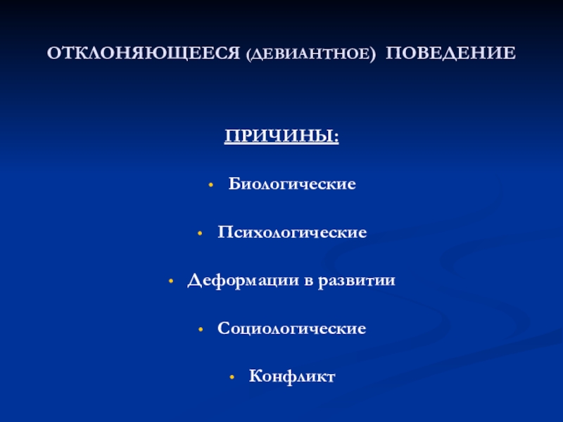 ОТКЛОНЯЮЩЕЕСЯ (ДЕВИАНТНОЕ) ПОВЕДЕНИЕПРИЧИНЫ:БиологическиеПсихологическиеДеформации в развитииСоциологическиеКонфликт