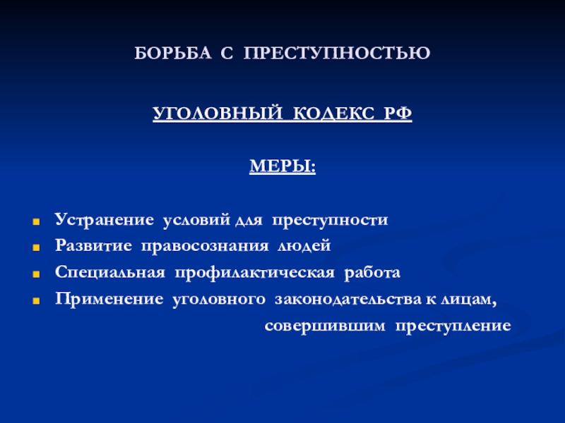 БОРЬБА С ПРЕСТУПНОСТЬЮУГОЛОВНЫЙ КОДЕКС РФМЕРЫ:Устранение условий для преступностиРазвитие правосознания людейСпециальная профилактическая работаПрименение уголовного законодательства к лицам,