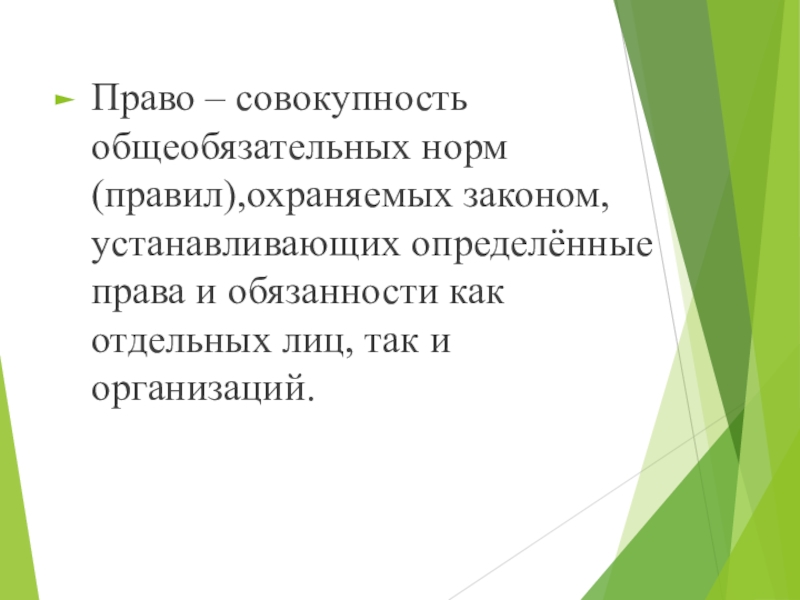 Слайд 4Право – совокупность общеобязательных норм(правил),охраняемых законом, устанавливающих определённые права и обязанности