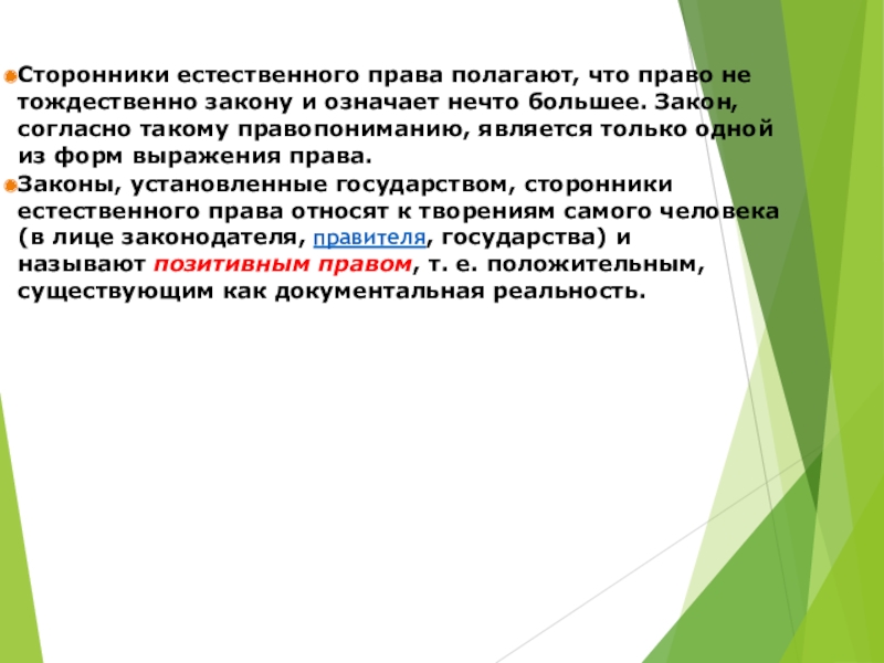 Слайд 10Сторонники естественного права полагают, что право не тождественно закону и означает