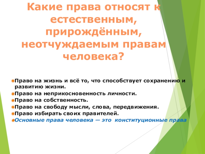 Слайд 15Какие права относят к естественным, прирождённым, неотчуждаемым правам человека?