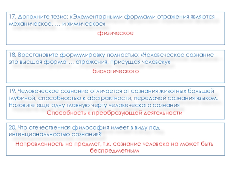 18. Восстановите формулировку полностью: «Человеческое сознание – это высшая форма … отражения, присущая человеку»