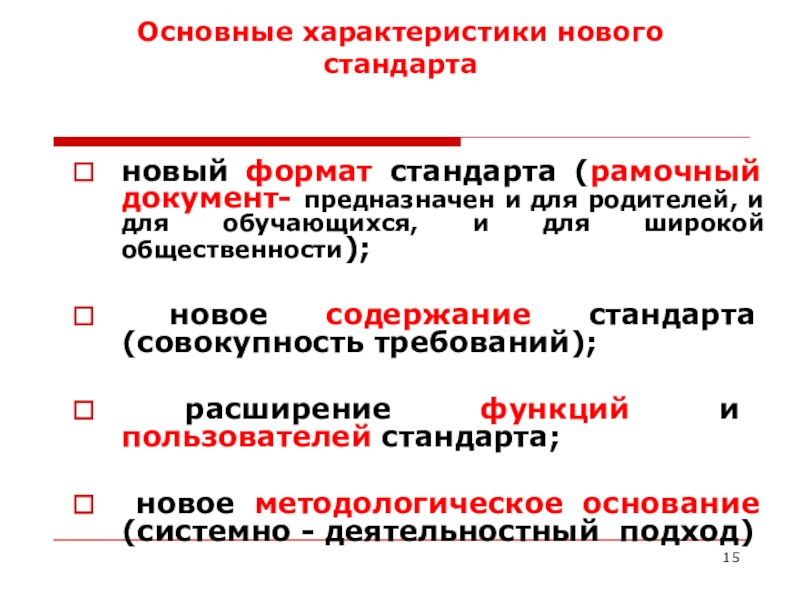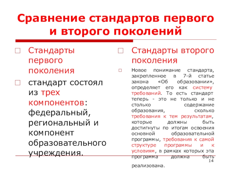 Новое понимание стандарта, закрепленное в 7-й статье закона «Об образовании», определяет его как систему требований. То есть стандарт теперь - это не только и не столько содержание образования, сколько требования к тем результатам, которые должны быть достигнуты по итогам освоения основной образовательной программы, требования к самой структуре программы и к условиям, в рамках которых эта программа должна быть реализована.
