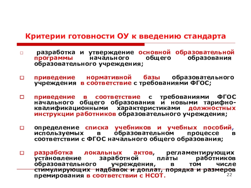 Слайд 22Критерии готовности ОУ к введению стандарта