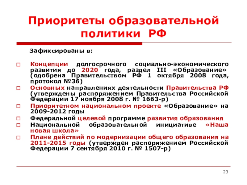 до 2020 года, раздел III «Образование» (одобрена Правительством РФ 1 октября 2008 года, протокол №36)