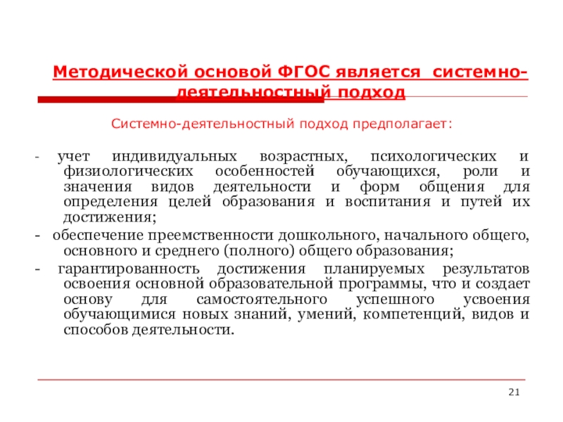 Слайд 21Методической основой ФГОС является системно-деятельностный подход