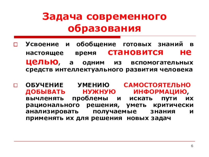 ОБУЧЕНИЕ УМЕНИЮ САМОСТОЯТЕЛЬНО ДОБЫВАТЬ НУЖНУЮ ИНФОРМАЦИЮ, вычленять проблемы и искать пути их рационального решения, уметь критически анализировать получаемые знания и применять их для решения новых задач