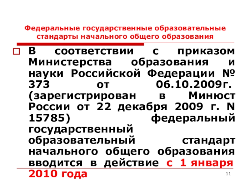 образования и науки Российской Федерации № 373 от 06.10.2009г. (зарегистрирован в Минюст России от 22 декабря 2009 г. N 15785) федеральный государственный образовательный стандарт начального общего образования вводится в действие с 1 января 2010 года