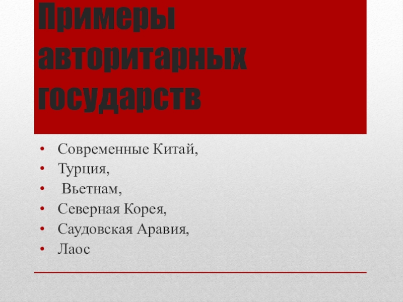 Примеры авторитарных государствСовременные Китай, Турция, Вьетнам,Северная Корея,Саудовская Аравия,Лаос