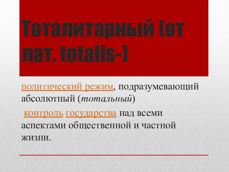 Тоталитарный (от лат. totalis-)политический режим, подразумевающий абсолютный (тотальный) контроль государства над всеми аспектами общественной и частной жизни.