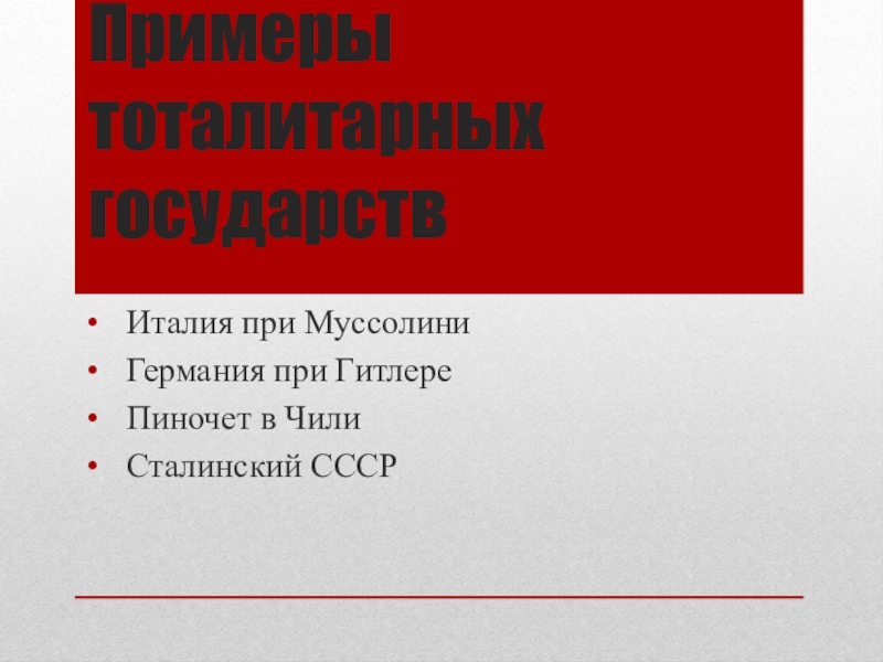 Примеры тоталитарных государствИталия при МуссолиниГермания при ГитлереПиночет в ЧилиСталинский СССР