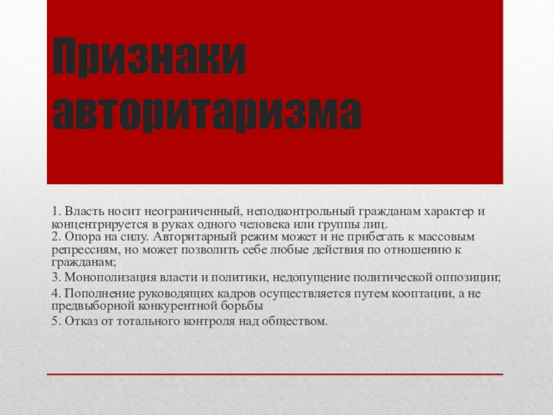 Признаки авторитаризма 1. Власть носит неограниченный, неподконтрольный гражданам характер и концентрируется в руках одного человека или группы