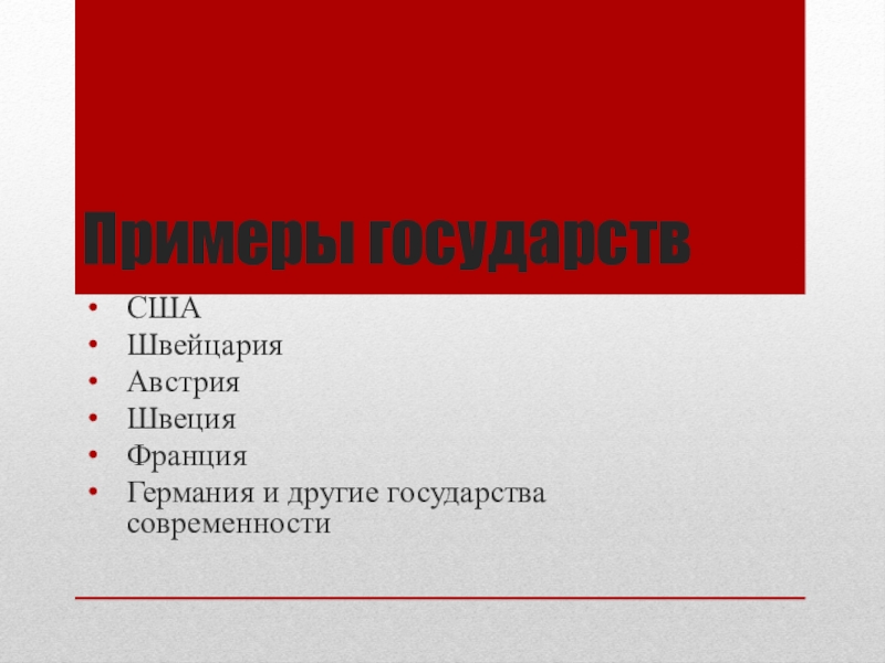 Примеры государствСШАШвейцарияАвстрияШвецияФранцияГермания и другие государства современности