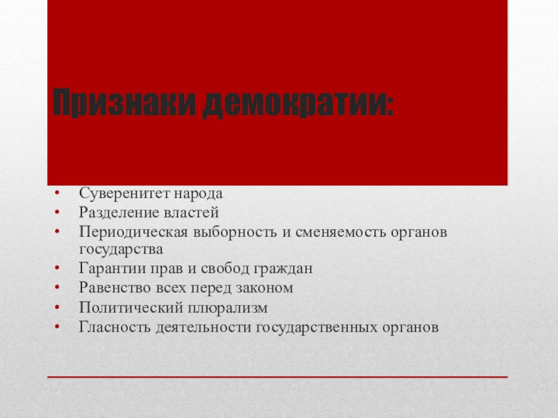 Признаки демократии:Суверенитет народаРазделение властейПериодическая выборность и сменяемость органов государстваГарантии прав и свобод гражданРавенство всех перед закономПолитический плюрализмГласность