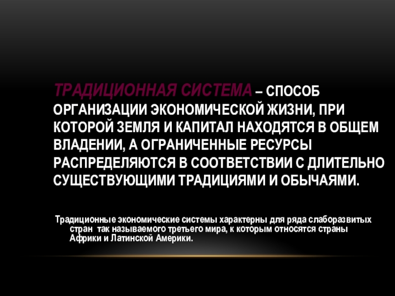 Традиционные экономические системы характерны для ряда слаборазвитых стран так называемого третьего мира, к которым относятся страны Африки и Латинской Америки.