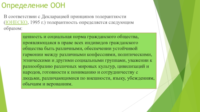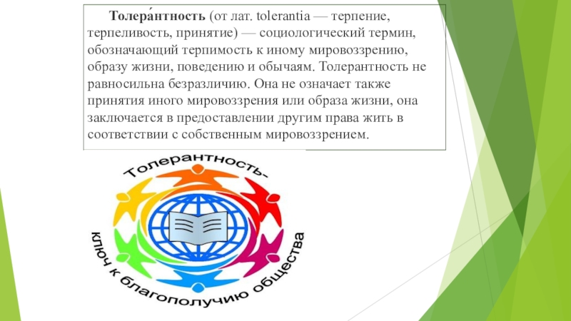 1) Социальная толерантность — это форма партнерского взаимодействия между различными социальными группами общества и его властными структурами, когда признаются необходимость сотрудничества и уважение позиций сторон.