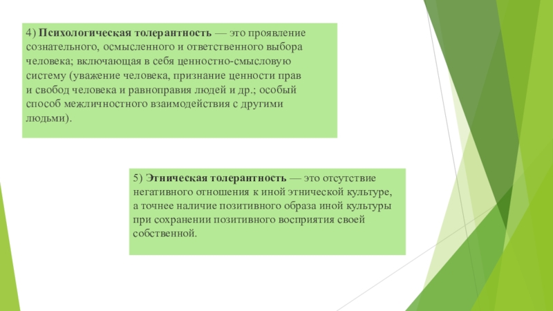 5) Этническая толерантность — это отсутствие негативного отношения к иной этнической культуре, а точнее наличие позитивного образа иной культуры при сохранении позитивного восприятия своей собственной.