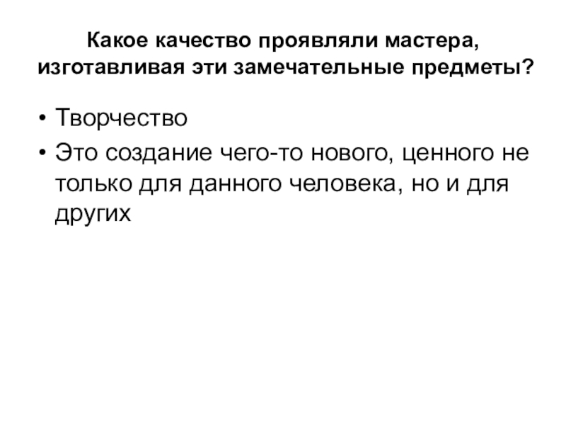 Какое качество проявляли мастера, изготавливая эти замечательные предметы?ТворчествоЭто создание чего-то нового, ценного не только для данного человека,