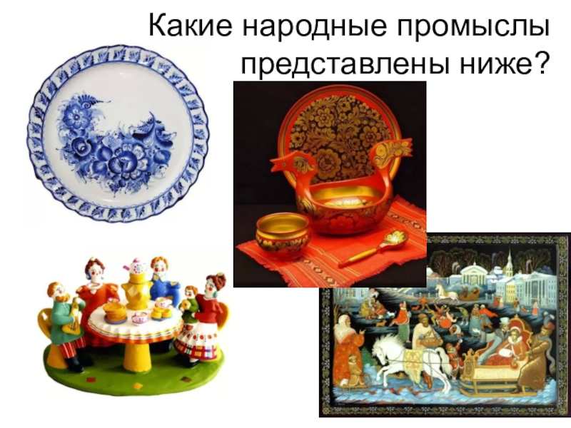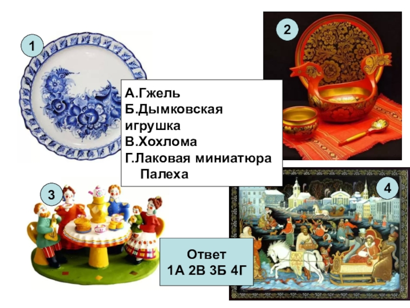 А.ГжельБ.Дымковская игрушкаВ.ХохломаГ.Лаковая миниатюра   Палеха1234Ответ1А 2В 3Б 4Г