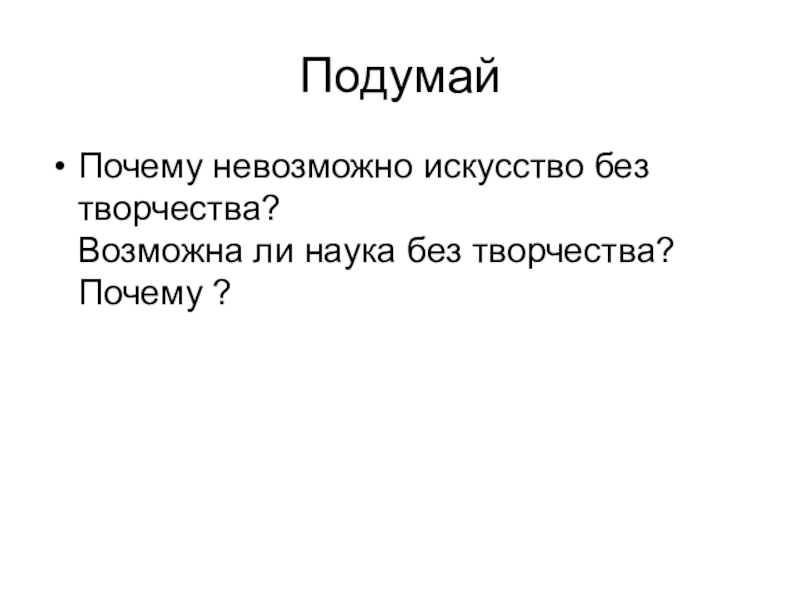 ПодумайПочему невозможно искусство без творчества? Возможна ли наука без творчества? Почему ?