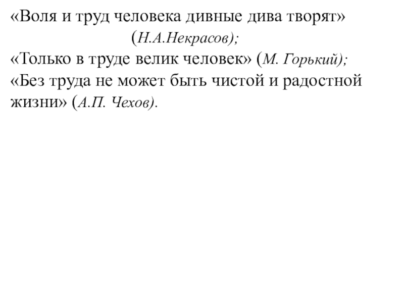 «Воля и труд человека дивные дива творят»  						(Н.А.Некрасов); «Только в труде велик человек» (М. Горький); «Без