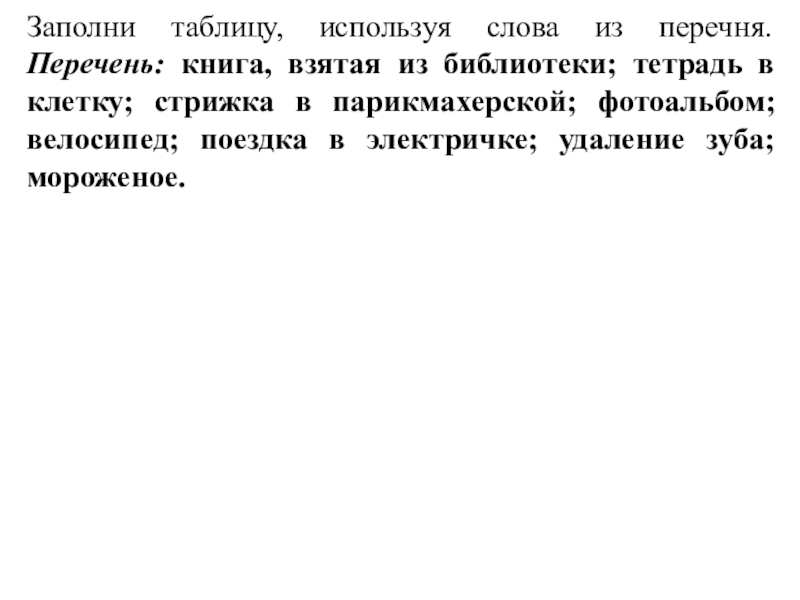 Заполни таблицу, используя слова из перечня. Перечень: книга, взятая из библиотеки; тетрадь в клетку; стрижка в парикмахерской;