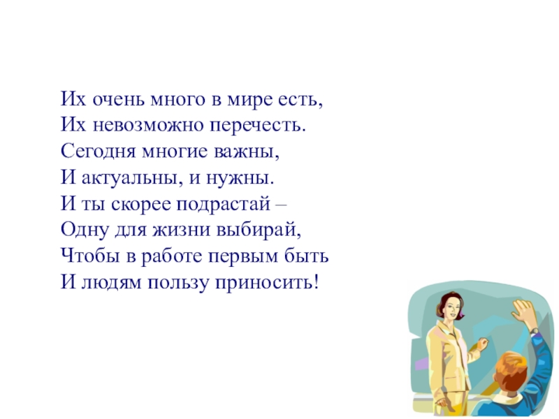 Их очень много в мире есть, Их невозможно перечесть.Сегодня многие важны,И актуальны, и нужны.И ты скорее подрастай