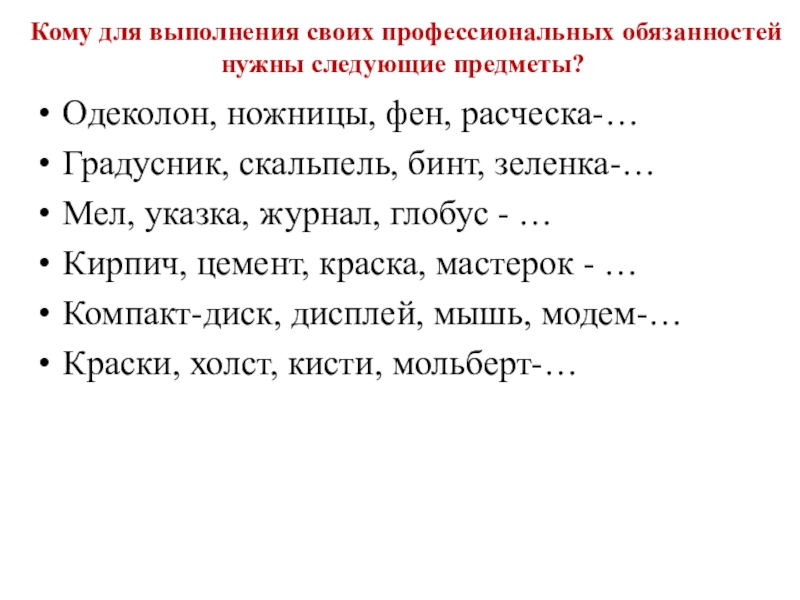 Кому для выполнения своих профессиональных обязанностей нужны следующие предметы?Одеколон, ножницы, фен, расческа-…Градусник, скальпель, бинт, зеленка-…Мел, указка, журнал,