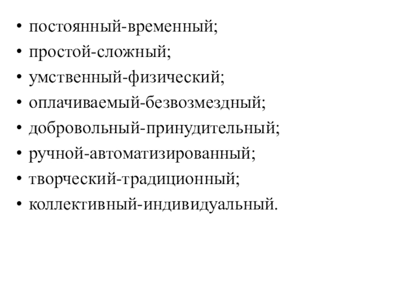 постоянный-временный;простой-сложный;умственный-физический;оплачиваемый-безвозмездный;добровольный-принудительный;ручной-автоматизированный;творческий-традиционный;коллективный-индивидуальный.