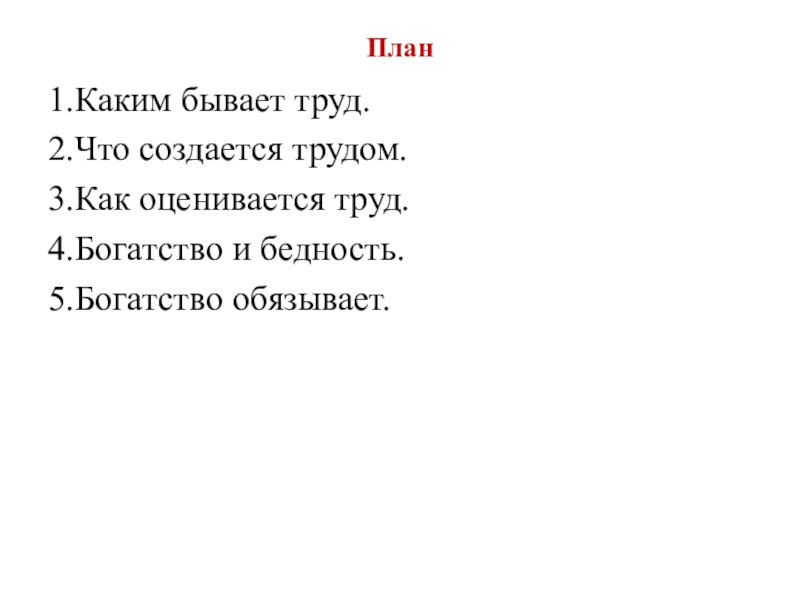 План 1.Каким бывает труд.2.Что создается трудом.3.Как оценивается труд.4.Богатство и бедность.5.Богатство обязывает.