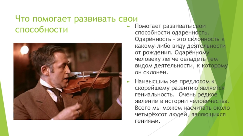 Что помогает развивать свои способностиПомогает развивать свои способности одаренность. Одарённость - это склонность к какому-либо виду деятельности