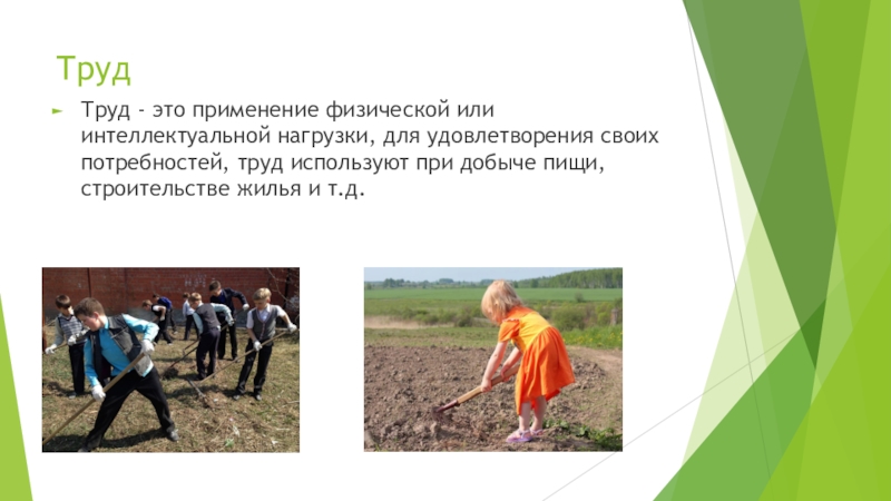 ТрудТруд - это применение физической или интеллектуальной нагрузки, для удовлетворения своих потребностей, труд используют при добыче пищи,