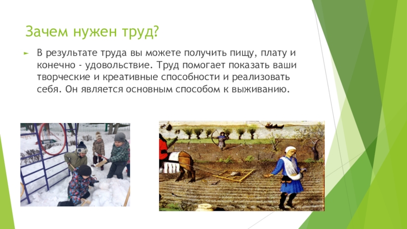 Зачем нужен труд?В результате труда вы можете получить пищу, плату и конечно - удовольствие. Труд помогает показать