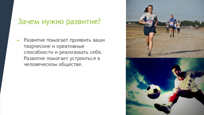 Зачем нужно развитие?Развитие помогает проявить ваши творческие и креативные способности и реализовать себя. Развитие помогает устроиться в