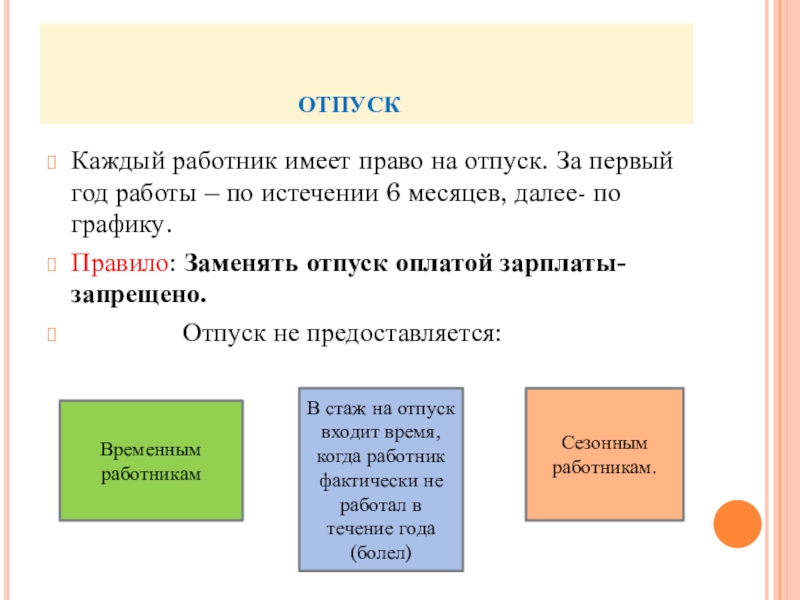 Каждый работник имеет право на отпуск. За первый год работы – по истечении 6 месяцев, далее- по графику.
