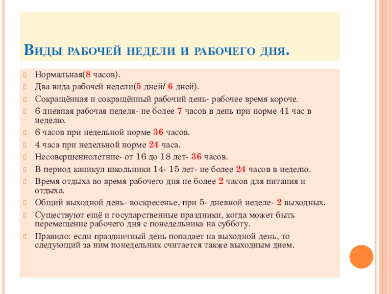 Сокращенный рабочий день и сокращённая рабочая неделя устанавливается в зависимости от характера и условий работы, а также категорий работников.
