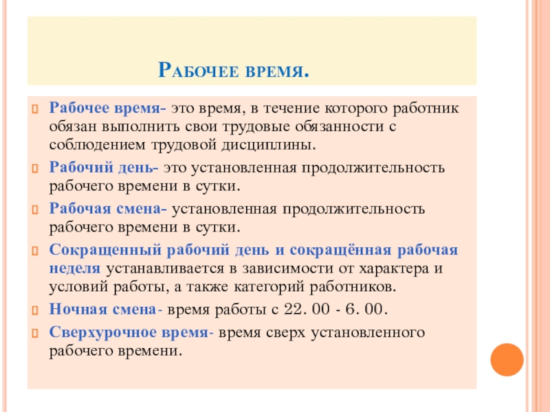 Рабочее время- это время, в течение которого работник обязан выполнить свои трудовые обязанности с соблюдением трудовой дисциплины.