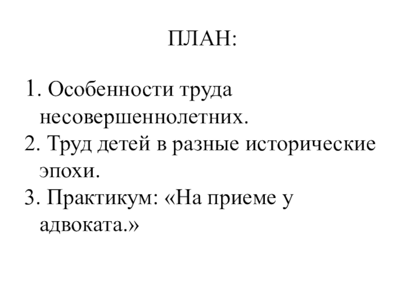ПЛАН:1. Особенности труда несовершеннолетних.2. Труд детей в разные исторические эпохи.3. Практикум: «На приеме у адвоката.»