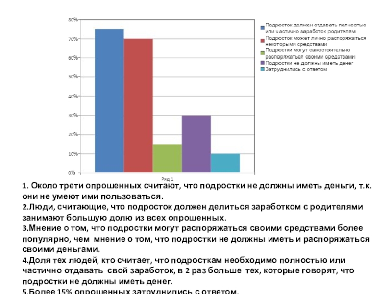 1. Около трети опрошенных считают, что подростки не должны иметь деньги, т.к. они не умеют ими пользоваться.