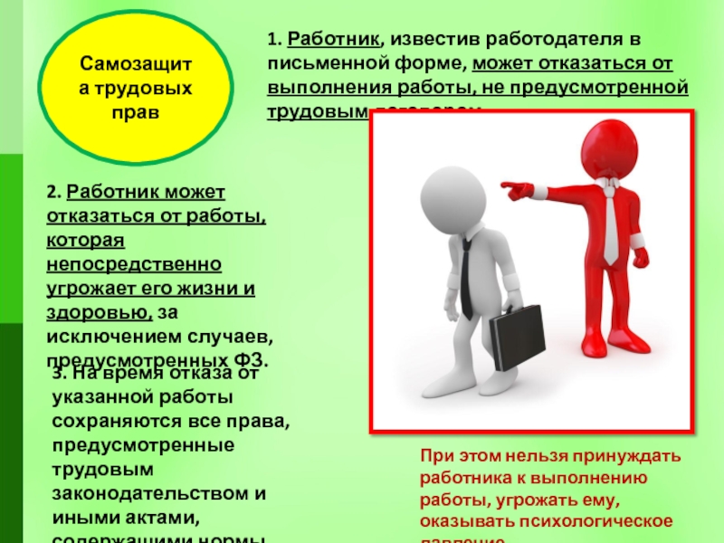 При этом нельзя принуждать работника к выполнению работы, угрожать ему, оказывать психологическое давление.
