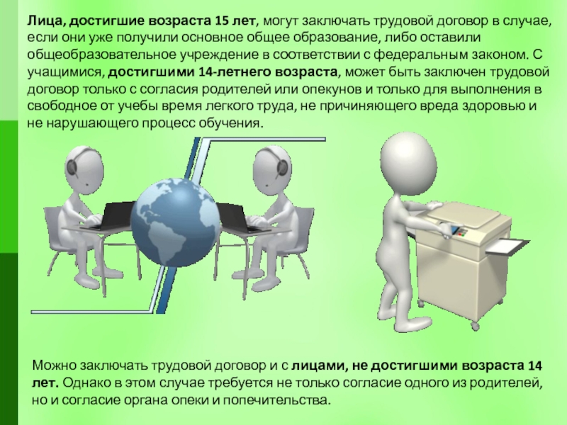Можно заключать трудовой договор и с лицами, не достигшими возраста 14 лет. Однако в этом случае требуется не только согласие одного из родителей, но и согласие органа опеки и попечительства.