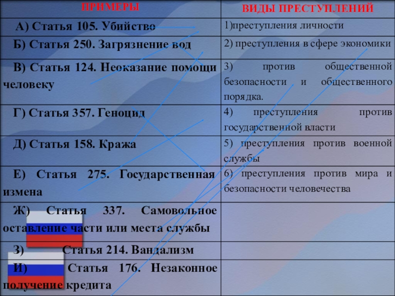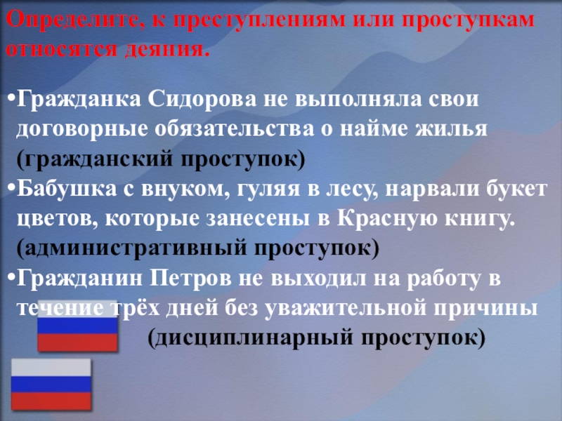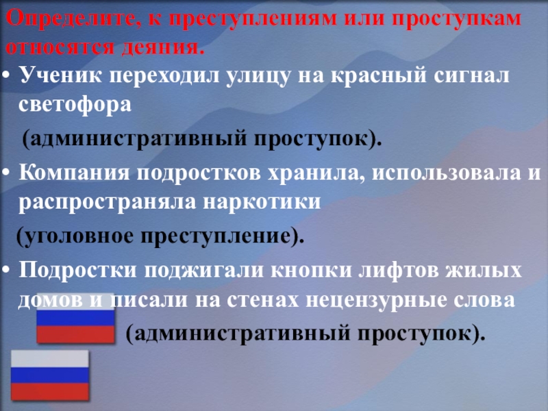 Слайд 10Определите, к преступлениям или проступкам относятся деяния.