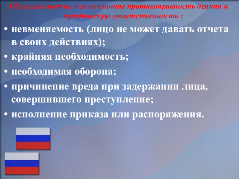 Слайд 15Обстоятельства, исключающие противоправность деяния и юридическую ответственность :
