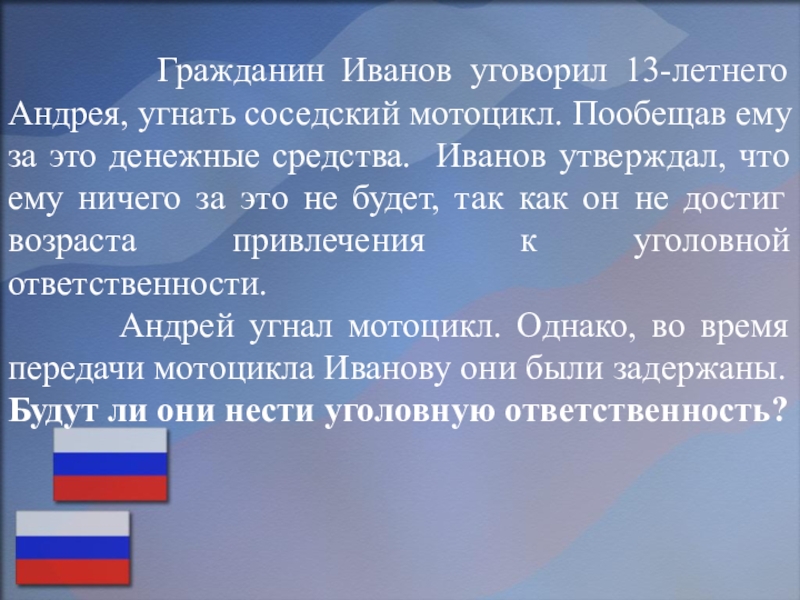 соседский мотоцикл. Пообещав ему за это денежные средства. Иванов утверждал, что ему ничего за это не будет, так как он не достиг возраста привлечения к уголовной ответственности.