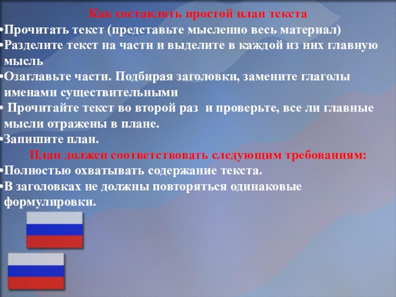 Прочитайте текст во второй раз и проверьте, все ли главные мысли отражены в плане.