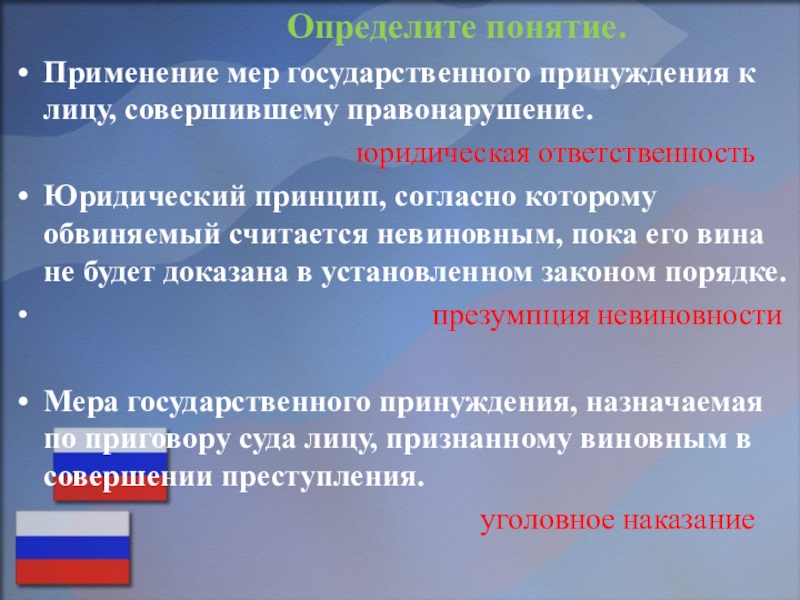 Юридический принцип, согласно которому обвиняемый считается невиновным, пока его вина не будет доказана в установленном законом порядке.